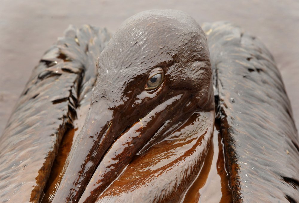 FILE – In this June 3, 2010 file photo, a Brown Pelican is mired in oil from the Deepwater Horizon oil spill, on the beach at East Grand Terre Island along the Louisiana coast. On April 20, 2010, a well blew wild under a BP oil platform in the Gulf of Mexico. Eleven workers were missing that day, and would later be declared dead. Ten years after the explosion on that Deepwater Horizon rig off Louisiana’s coast, The Associated Press is making the original story and photographs available. (AP Photo/Charlie Riedel, File)